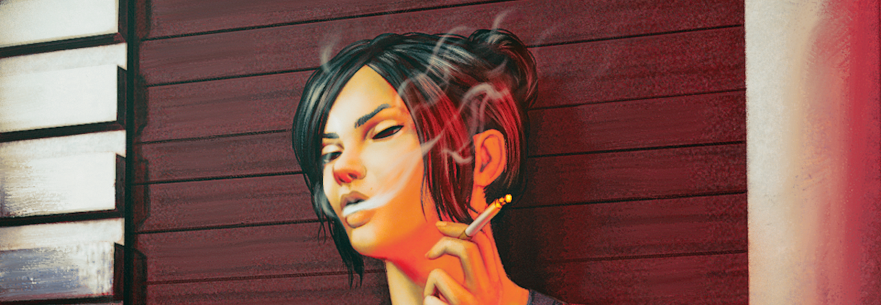 "Well, Nurse Eustace, I think I have a little twinge with my neck. Want to," she says pulling her strap back from her neck a little with the hand holding the half-smoked cigarette, "get a beer while you give me some medical advice?"