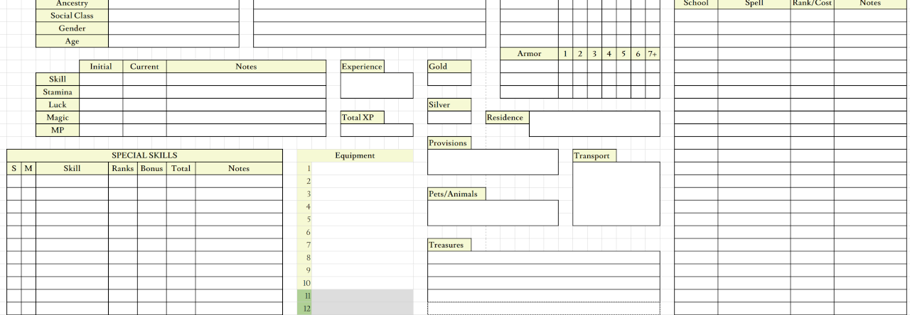 Anyhow, after an hour or two of plucking away and giving things thoughts, I came up with this: Doug's "Quick" Advanced Fighting Fantasy Character Sheet (in ODS format). Feel free to use it in any way you want. I might make a v2+ as I actually play out the new campaign and figure out mistakes made and such.