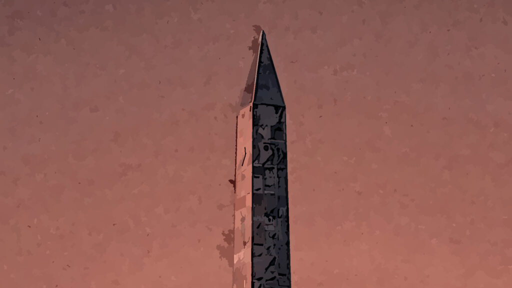Half an hour later, the pair approach an obelisk. Perhaps once ivory-white, it has grayed with time and the elements. Yet, it still stands strong. And strange in this land.