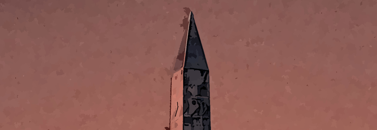 Half an hour later, the pair approach an obelisk. Perhaps once ivory-white, it has grayed with time and the elements. Yet, it still stands strong. And strange in this land.