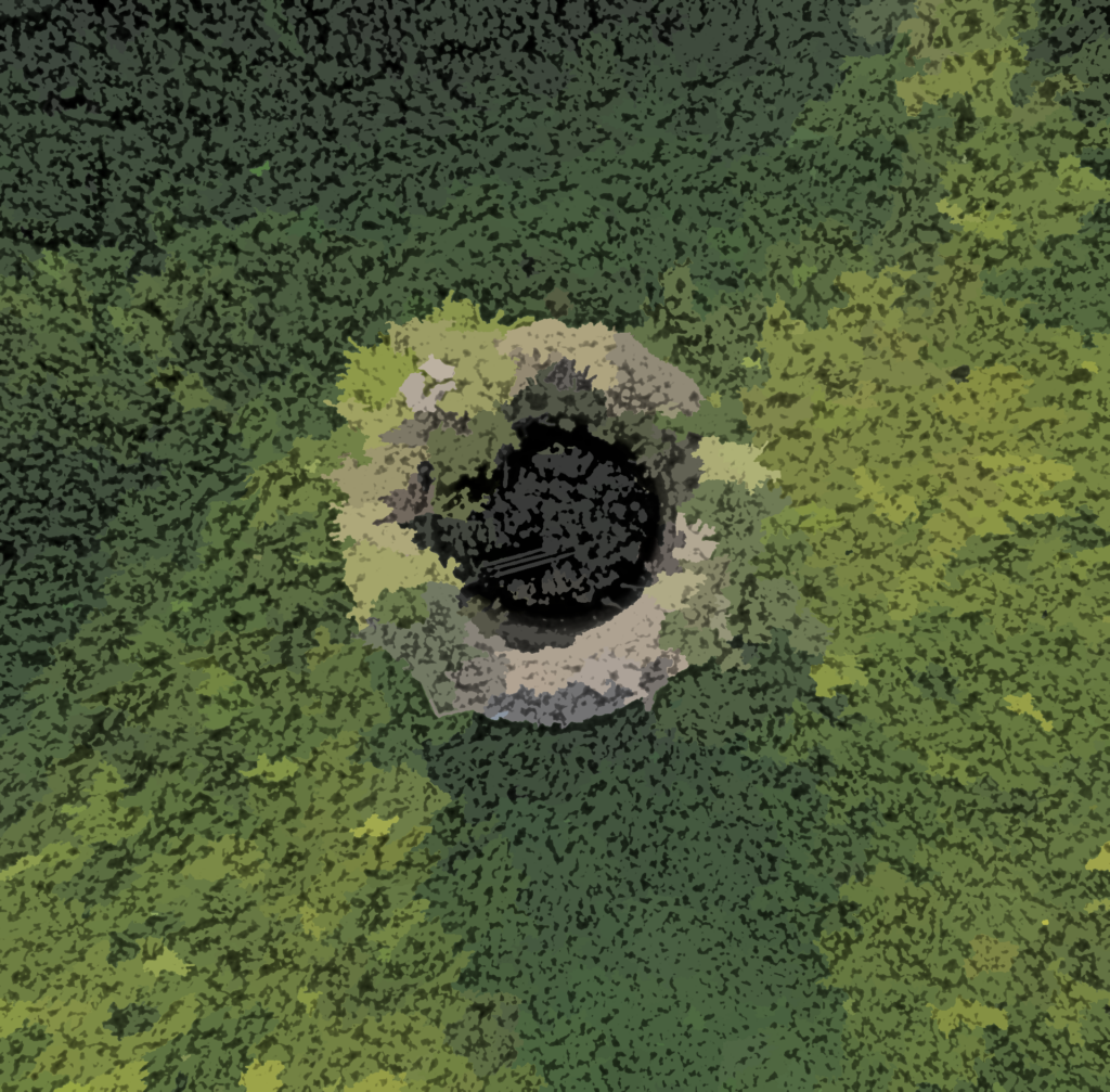 Soon enough, the skeletons reach what seems to be their destination. A pit. Partially pre-existing. Partially freshly dug. Some large, round stone structure has been cleared out and the skeletons crawl over and go down into the center of the excavation. Barston and Derron look at each other, then decide to follow.