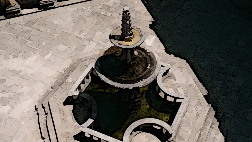 They spotted the fountain from a distance, at least the courtyard surrounding it. A cobblestone road lead south in roughly the direction the unicorn had mentioned and so Barston had opted for it.