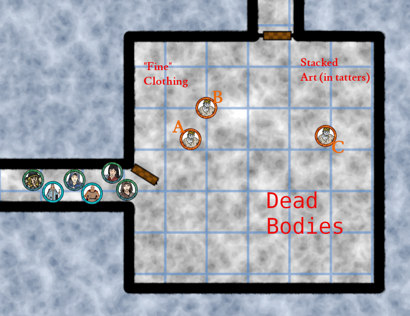 In the description {DH26} it says the room is square and full of "rather desiccated" bodies. Smell is dusty rather than rotten. There are also two zombies in here that will attack one round after opening the door. Since AFF doesn't really use Rounds/Turns/etc outside of combat, I'll meet the author half way. I'll roll 3d6. Each dice > 3 (4-6) represents a degree of additional agitation. The group is in rough pairs as far as marching order goes. 0 = everyone is in the room, 1 = all but the final pair, 2 = only the first pair, 3 = attacks immediately before the first pair enters.