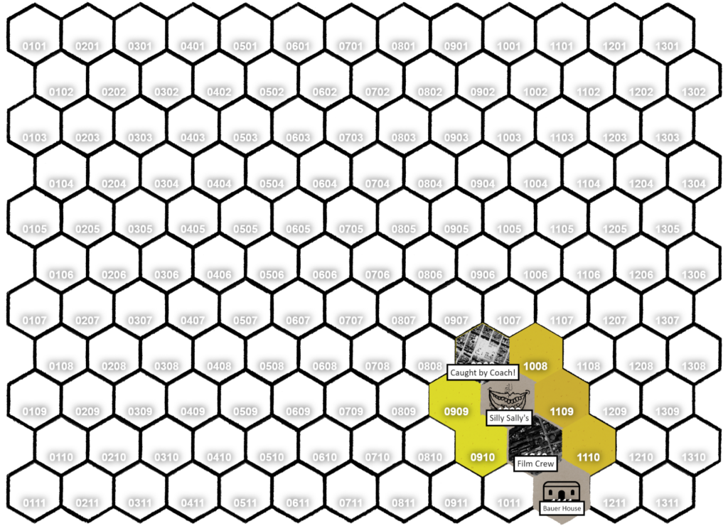 • Start. It's not written as such, but I'll say the starting hex is the character home. I'll put the Bauer household to the right-hand side of the bottom (Hx1111).