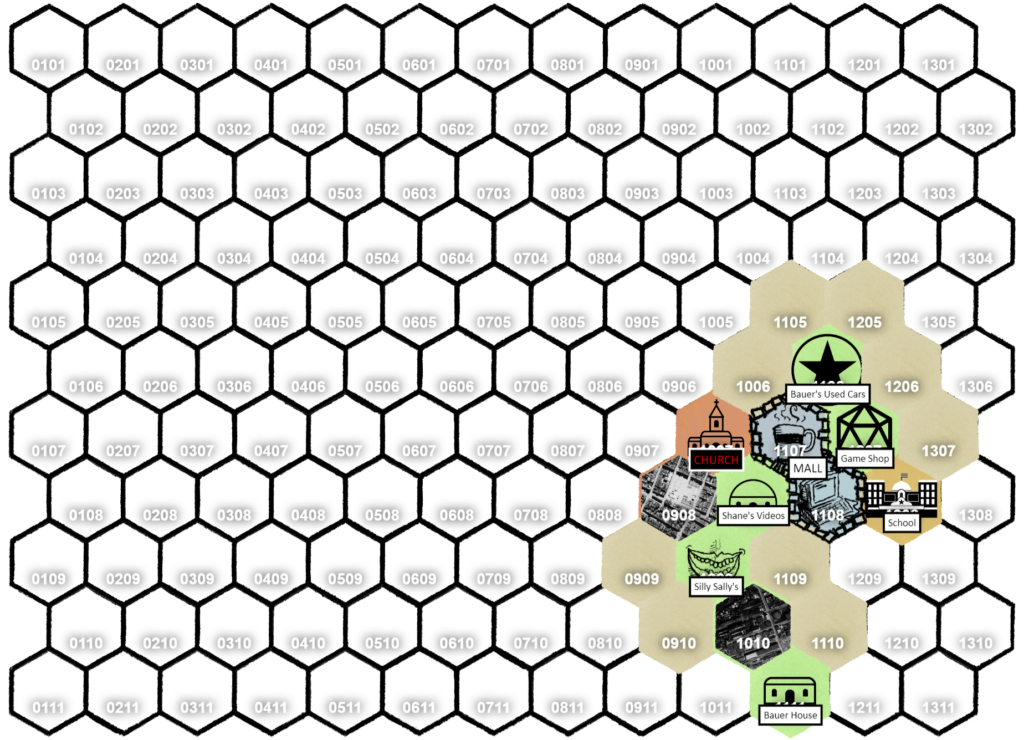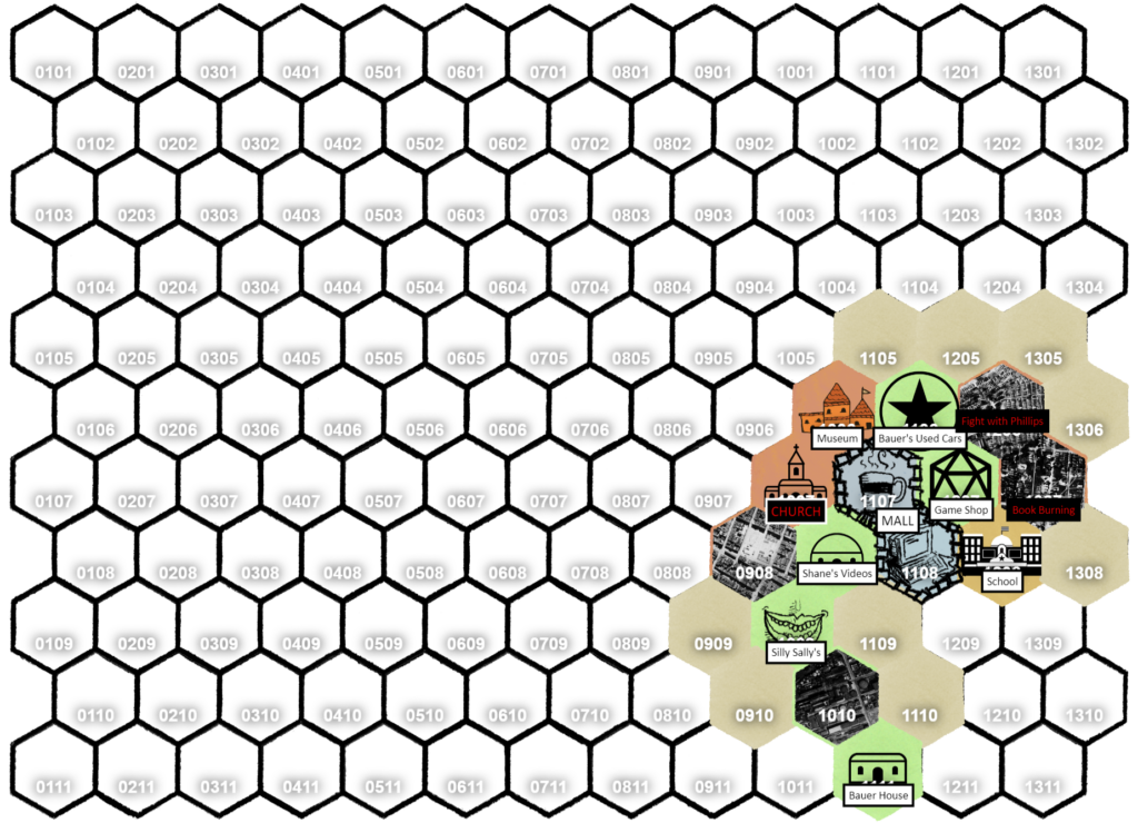 If Everett doesn't make it, and possibly because of how I'm playing it, it doesn't seem exactly likely he will fail, then I'm not 100% sure how I'll handle the next kid's starting spot. The 11x13 hexes seems like a LOT considering how fast stuff shows up. With the persistent map rule, it would be silly to not put them in the same rough half, give or take. And this is with me already adding 2-3 new locations not in the original module.