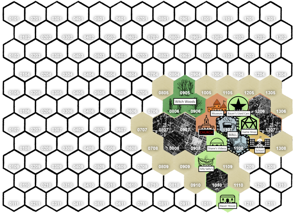 - Maybe it's just me, but there were several aspects I did not understand like...it seems silly that you would have more than one school/mall but what are you supposed to do in regards to the hex map when a second shows up? Reroll? A "if the school exists, then..." secondary column might have helped.