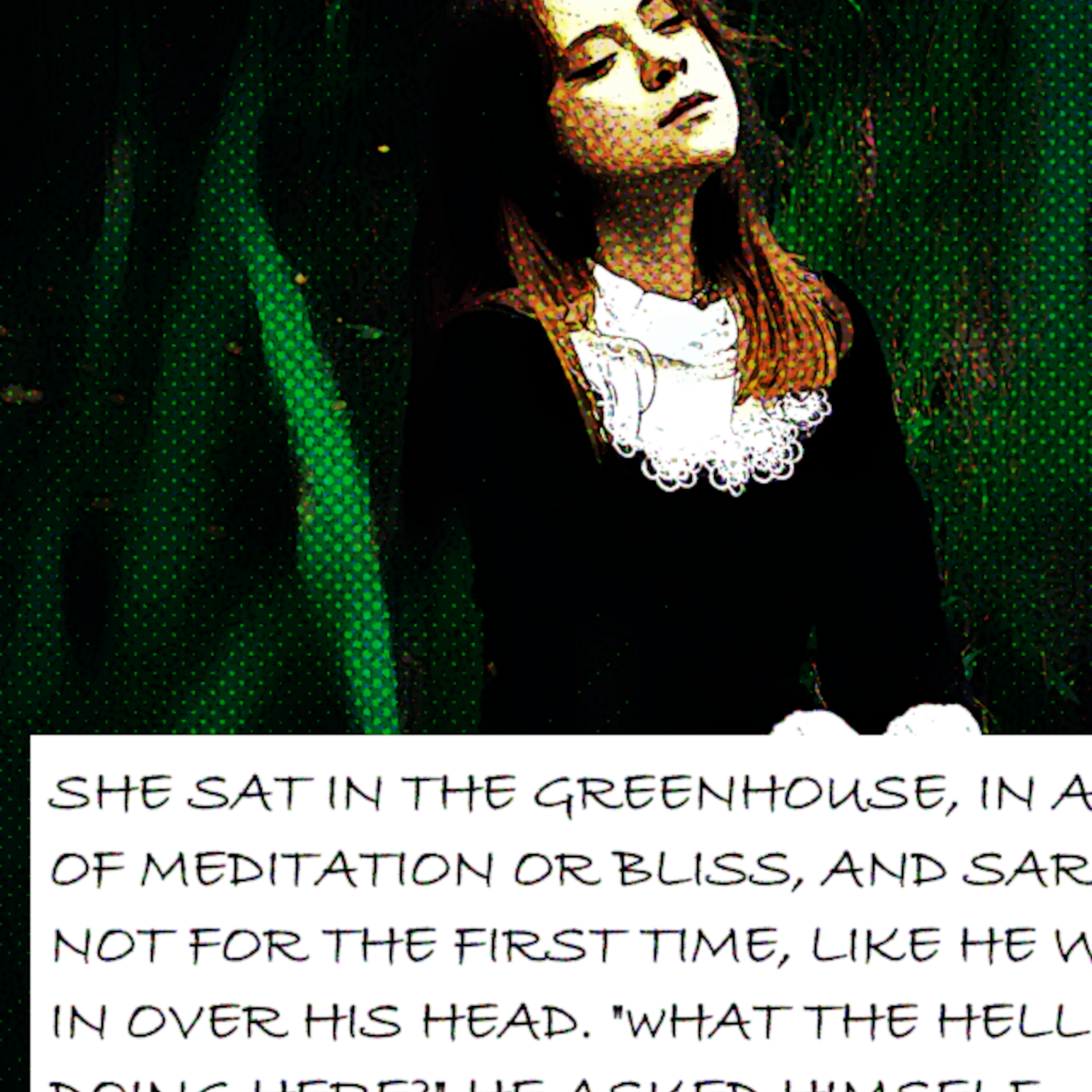 She sits in the green house in greenhouse, in a state of meditation or bliss. Sarge feels, not for the first time, like he is in over his head. "What the hell am I doing here?," he asks himself. Aloud.