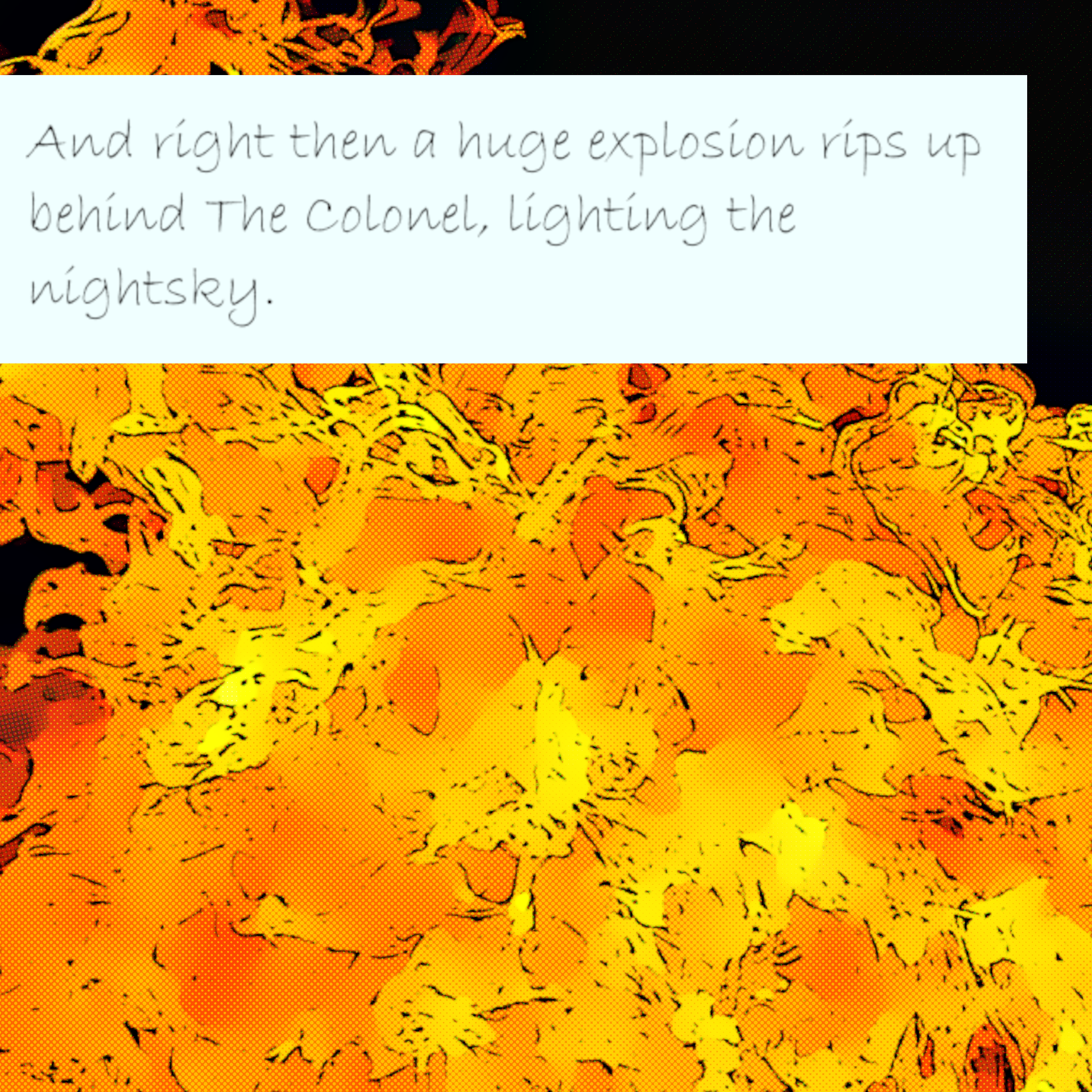 And right then a huge explosion rips up behind The Colonel, lighting the night sky. The light and sound stagger the gunman, and The Colonel opens fire.